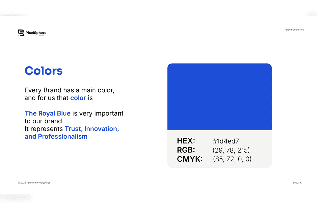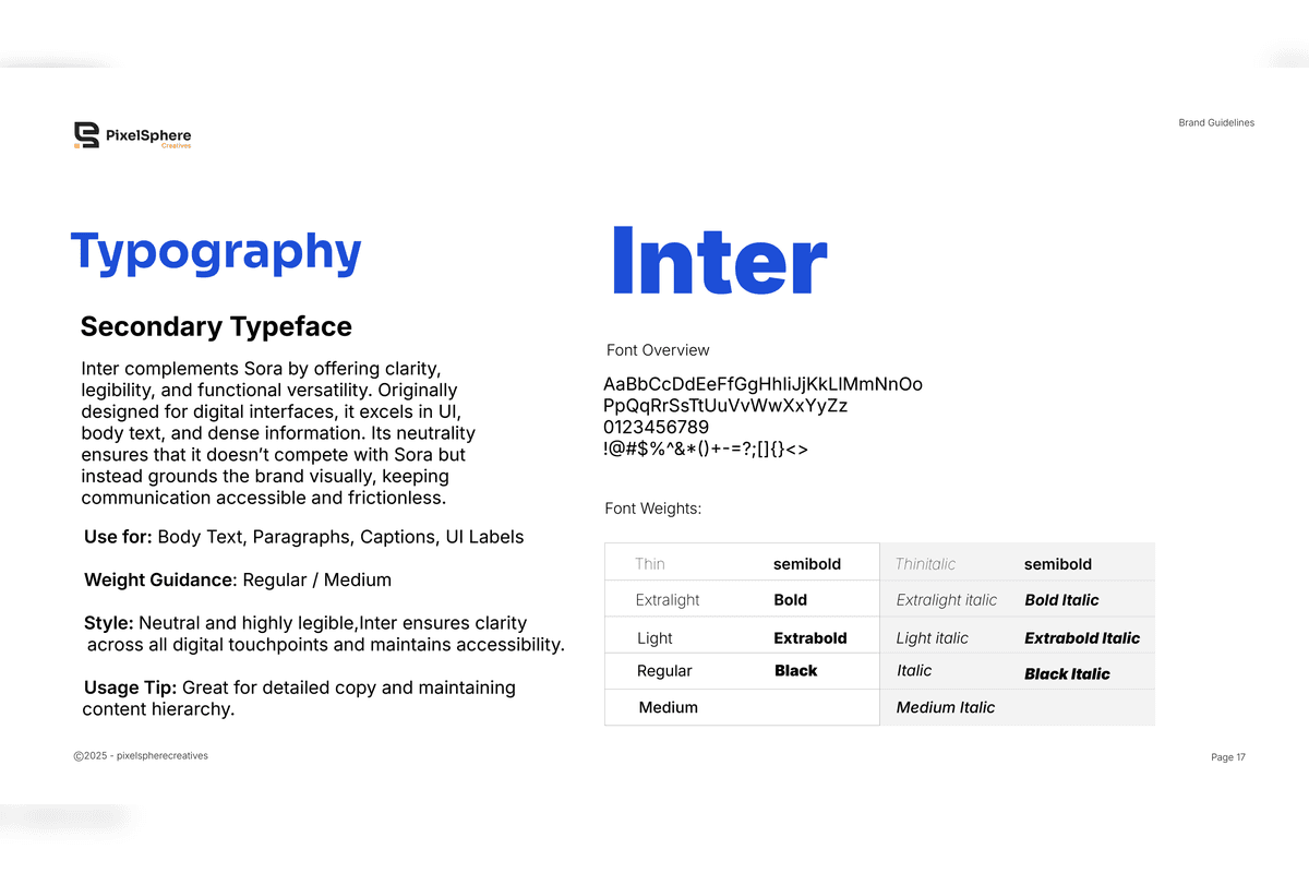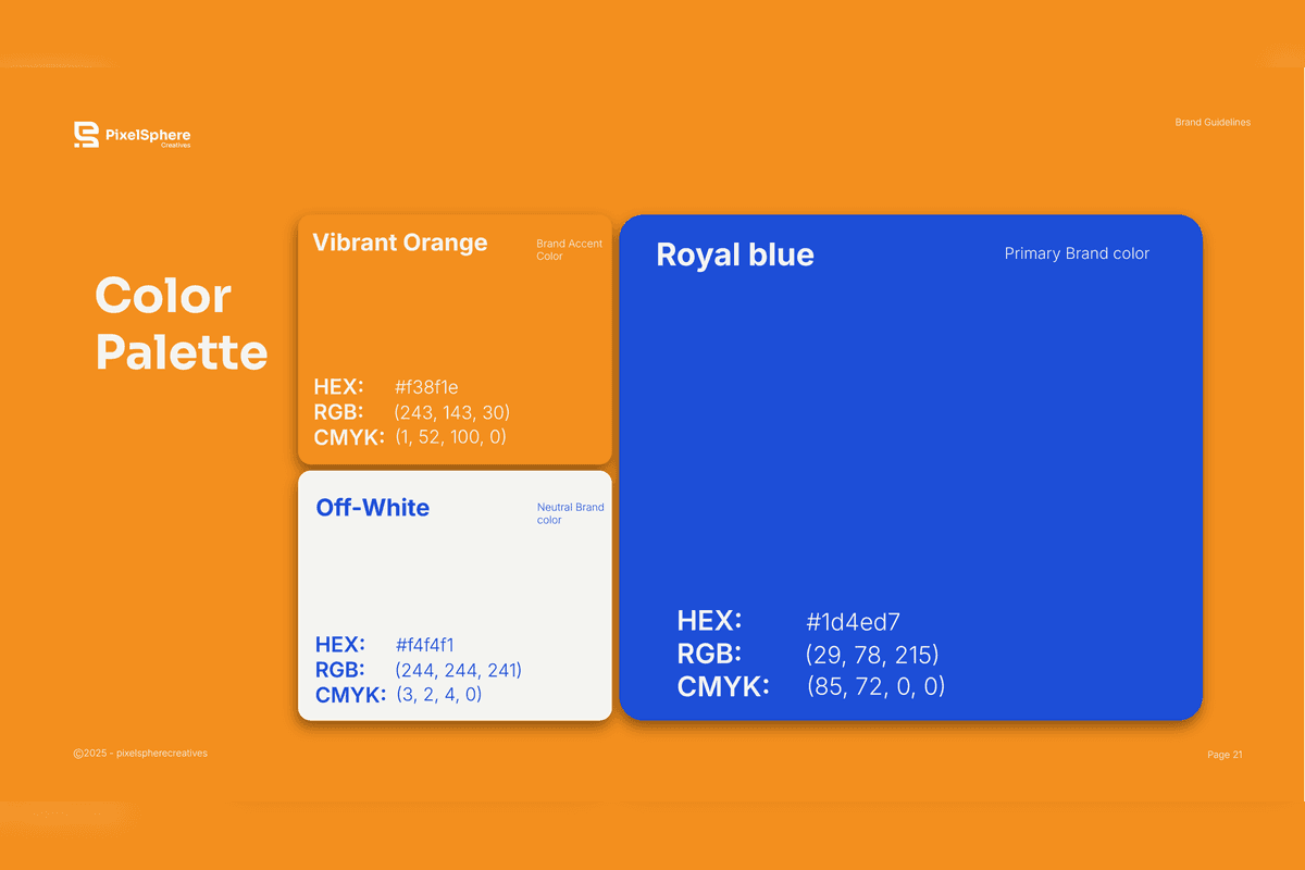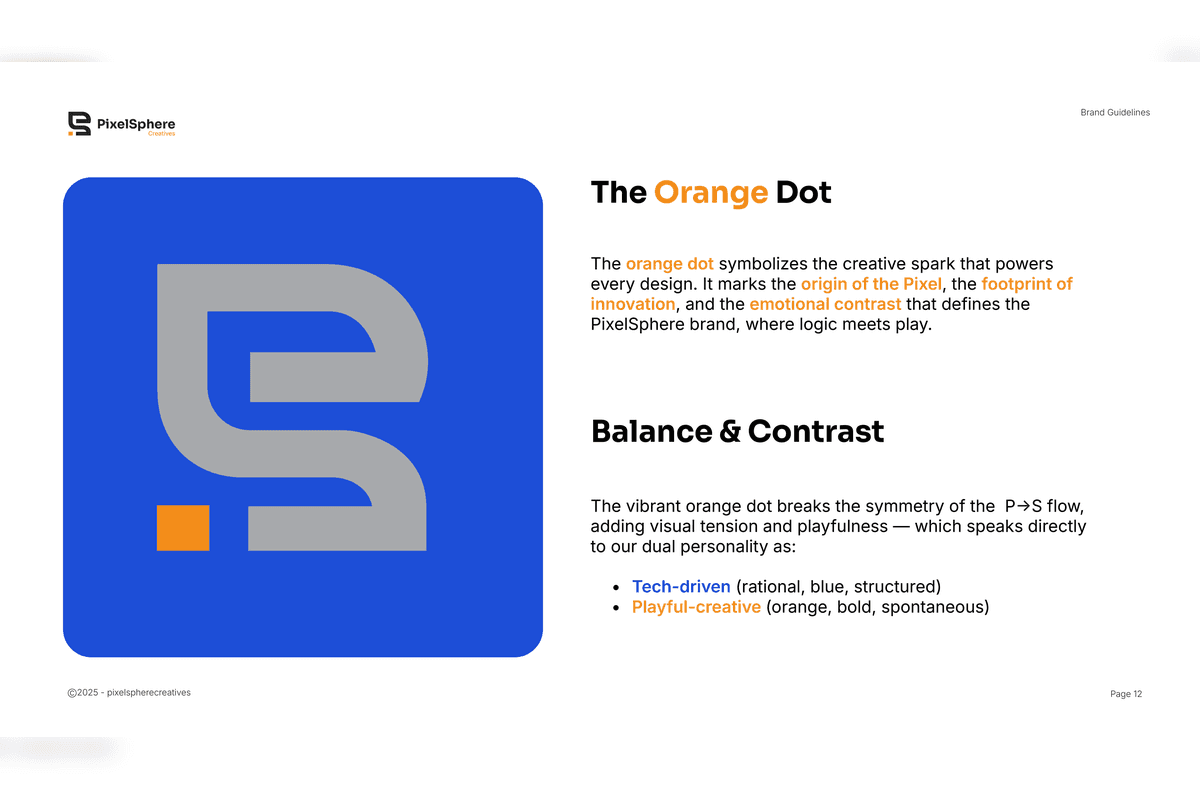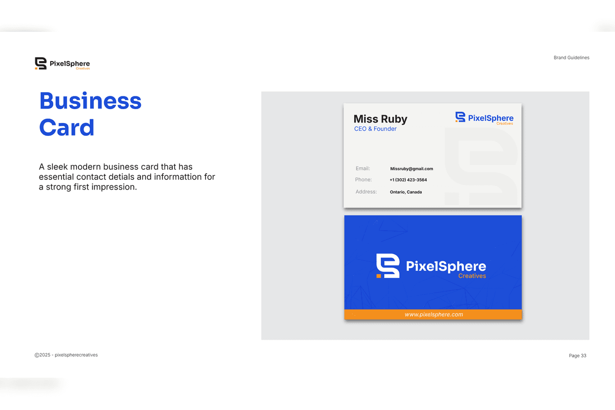 The result is a cohesive and scalable brand system that strengthens PixelSphere’s positioning as a modern, professional, and growth-focused agency — ensuring consistency across all platforms and future expansion.